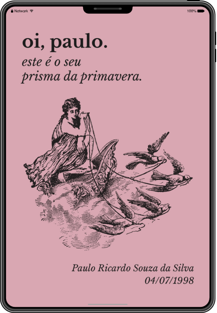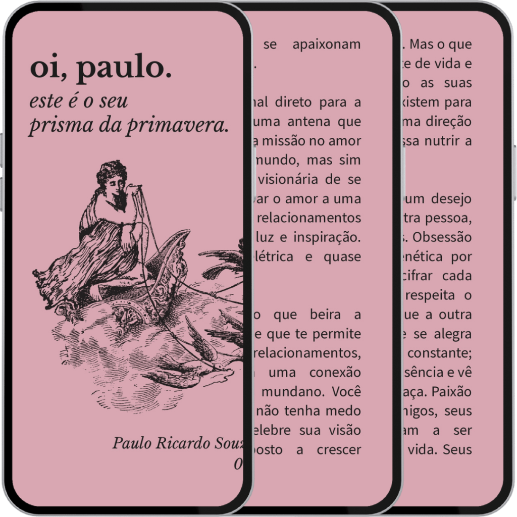A interpretação completa do seu Prisma da Primavera é enviada em formato PDF para o email cadastrado no seu pedido. O prazo de envio é de até 24 horas após o pagamento.